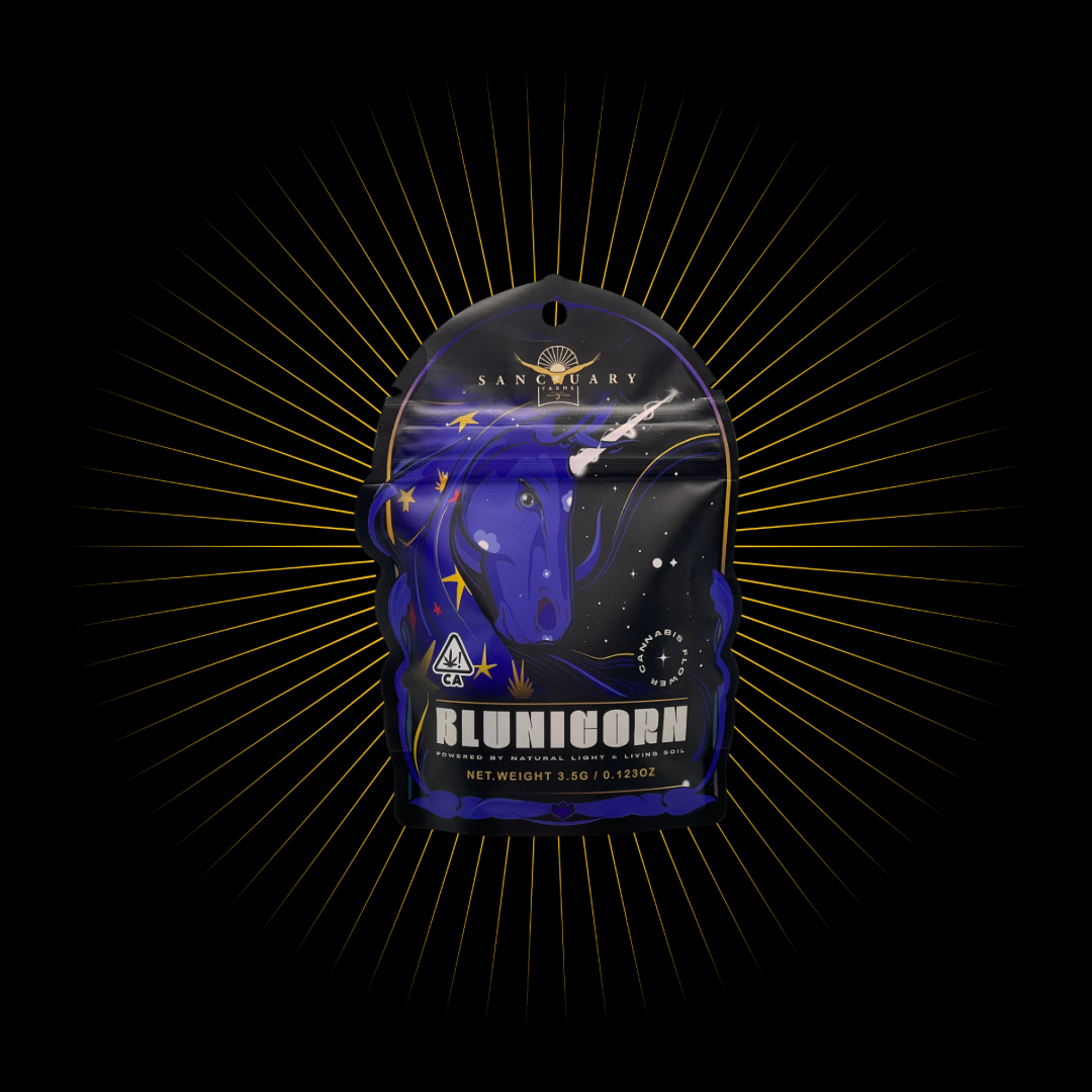 Sanctuary Farms’ Blunicorn is a balanced hybrid strain made from the genetic cross of Unicorn Poop and Blue Sherbert. Our Blunicorn has a complex terpene profile that starts with a pungent cheesy, earthy funk but has a fruity bright blueberry tint at the end. The dominant terps are Caryophyllene mixed with Myrcene and Limonene with just a hint of Linolool.