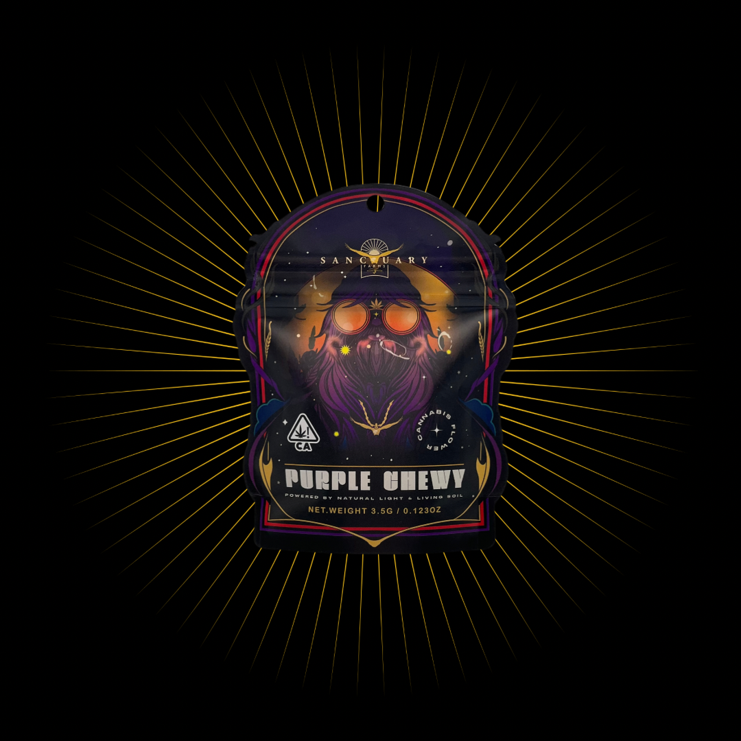 Sanctuary Farms Purple Chewy: An Uncommon Blend of Purple Sierra and NY Sour Diesel This hybrid strain boasts a classic pine aroma with a strong diesel flavor, almost like gasoline. It's characterized by a sweet classic purp undertone with a hint of tanginess at the finish. The herbaceous smoke balances out the flavor profile. Despite being Sativa Dominant, the relaxing yet euphoric effects make it a unique choice for any occasion. This is an exclusive Sanctuary Farm cultivar.